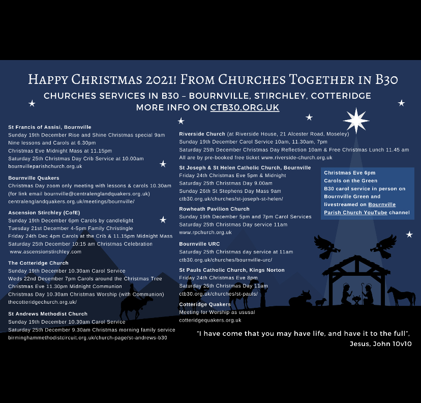 Christmas Eve 6pm ‘From the Green to your Screen’ – join us online for B30 Churches Together carol service, streamed through Bournville Parish Church Youtube.